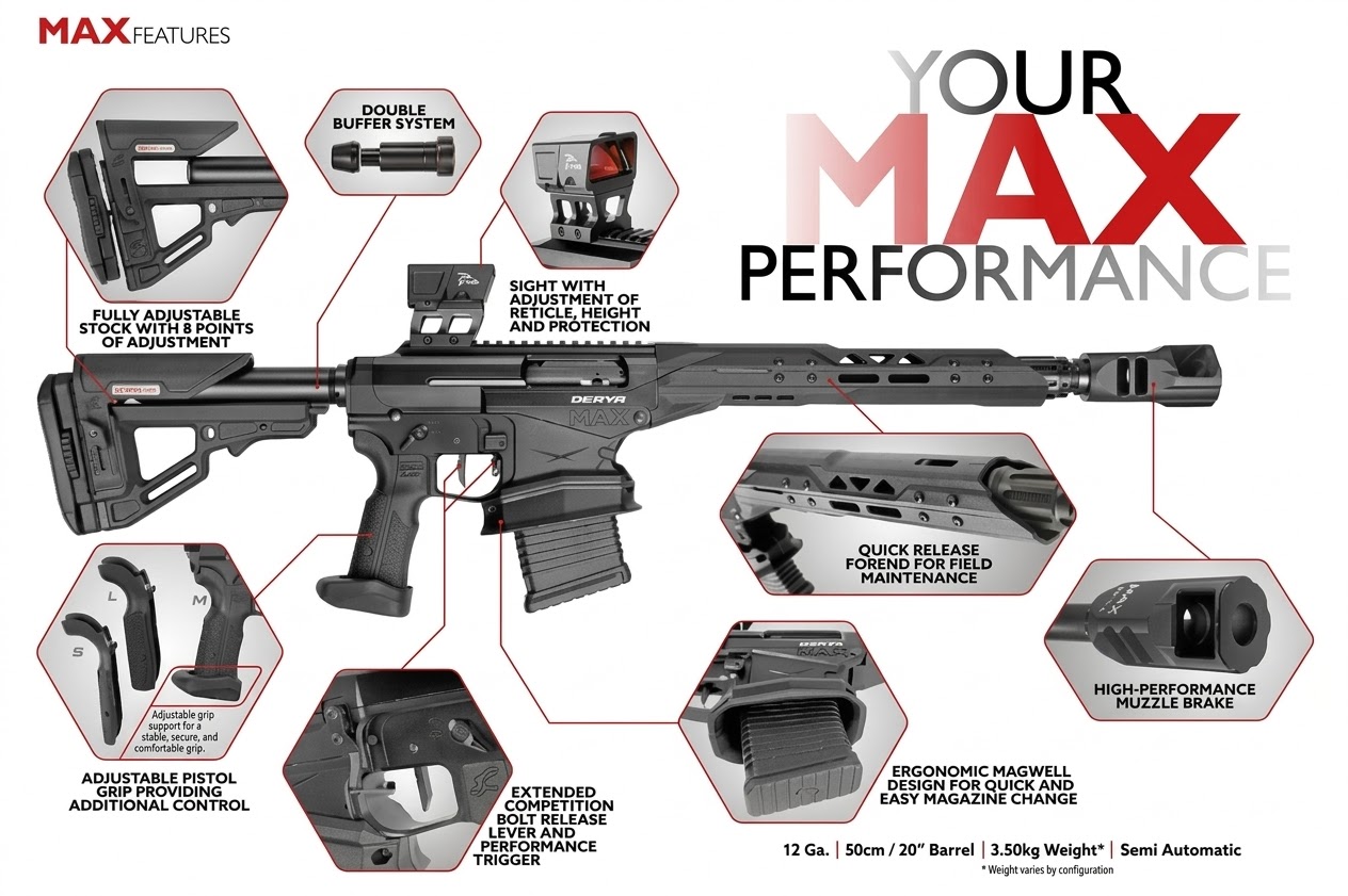 Yeni Derya MAX (F-5001) yarı otomatik taktik ve av tüfeği, dünyanın en iyi atıcıları ve profesyonel mühendislerin ortak çalışması sonucunda geliştirilmiştir. Dünya ve Kıta şampiyonalarında elit yarışmacılar tarafından test edilip onaylanan bu model; üstün güvenilirliği, rafine ergonomiyi ve ateşli silah teknolojisindeki en son yenilikleri bünyesinde barındırır.