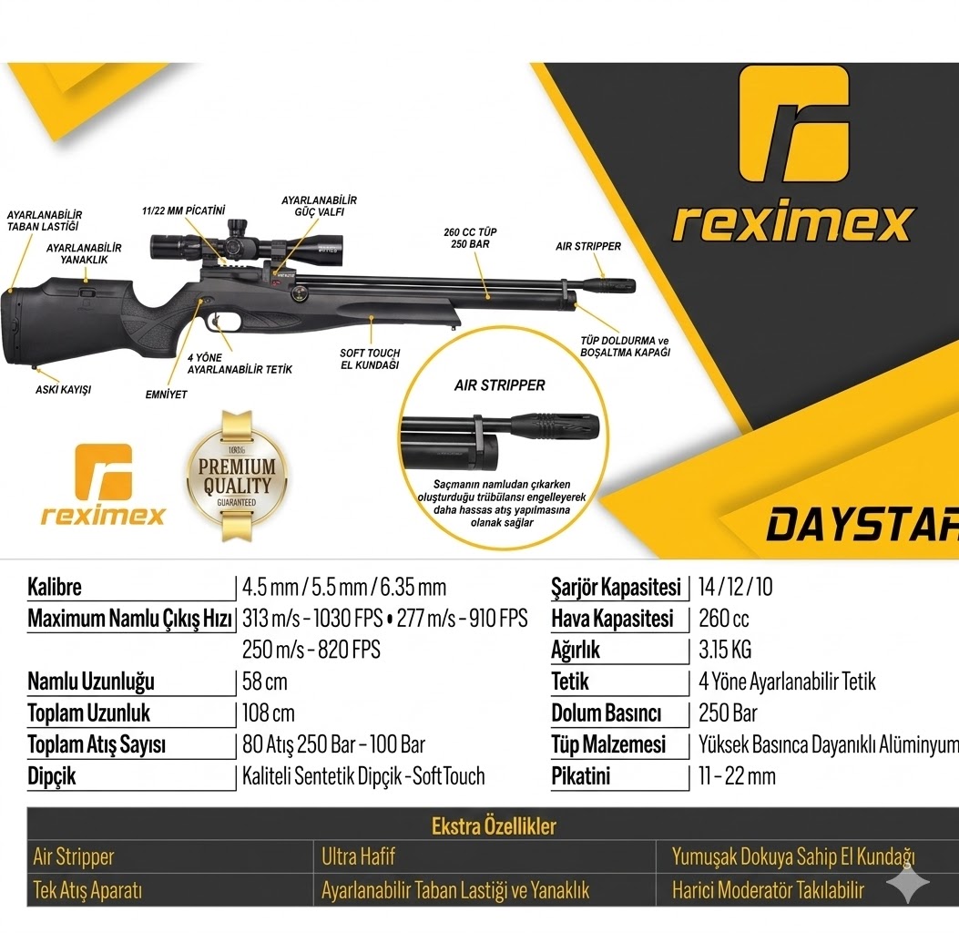 Reximex Daystar, atıcılara maksimum kontrol ve atış stabilitesi sunmak üzere tasarlanmış, üst segment bir PCP (Pre-Charged Pneumatic) havalı tüfektir. 5.5mm (.22 kalibre) çapındaki bu model, 260 cc'lik geniş hava tüpü kapasitesi ve 250 bar dolum basıncı ile tek dolumda istikrarlı ve yüksek sayıda atış yapmanıza olanak tanır. Modern çizgiler barındıran dayanıklı kundağı, ayarlanabilir yanaklık ve dipçik tabanı sayesinde silahınızın vücut anatominize kusursuz bir şekilde uyum sağlamasını garantiler.
